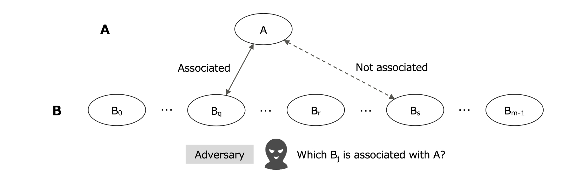 Definition 3 (Association). Let O be a set of objects. If A ∈ O and B ∈ O satisfy either of the following conditions from the perspective of a participant (e.g., an adversary), we call the relation between A and B ‘A and B are associated.’ (We define a boolean function Assoc : O2 → {0, 1} as Assoc(A, B) = 1 if and only if A and B are associated.)