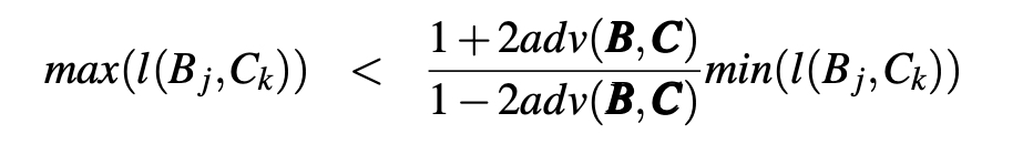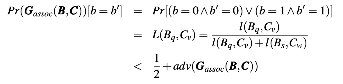 where l(Ai, Bj) is the likelihood that Bj is associated with Ai from the adversary’s perspective, and L(Ai, Bj) is the conditional likelihood that Bj is associated with Ai from the adversary’s perspective after they are sent Pb in the indistinguishability game Gassoc(A, B).