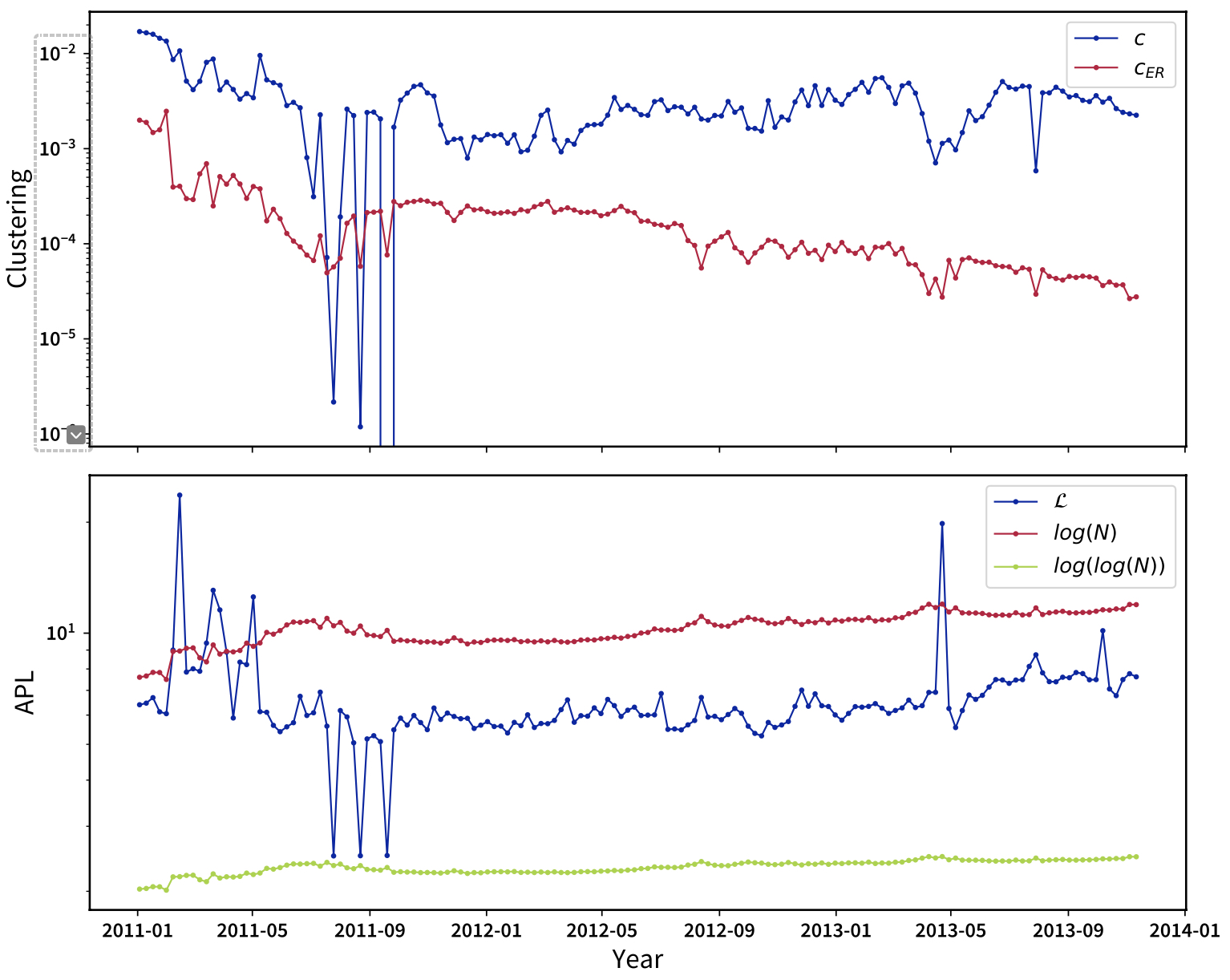 where \(C_i=\sum_{j(\neq i)}\sum_{k(\neq i,j)}a_{ij}a_{jk}a_{ki}/k_i(k_i-1)\), with the one predicted by the same model, i.e., \(\langle\text{ACC}\rangle_\text{ERM}=p=2L/N(N-1)\). Computational constraints have forced us to limit our analysis to the giant connected component, during the first half of the period under consideration (i.e., until 2014). The results are displayed in Figure 8: since \(\ln(\ln N)<\text{APL}<\ln N\propto\langle\text{APL}\rangle_\text{ERM}\) and \(\text{ACC}>\langle\text{ACC}\rangle_\text{ERM}\) across the entire period, Bitcoin can be claimed to be small-world.